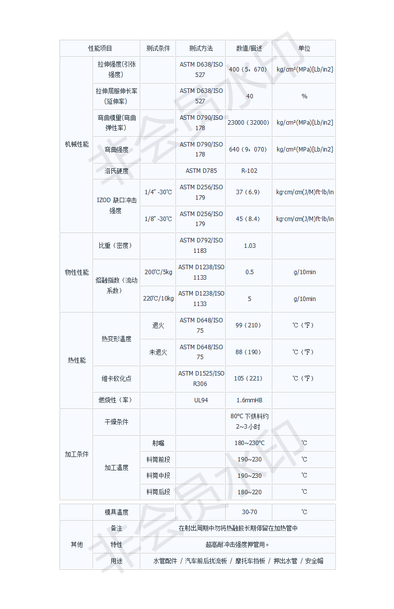 1、無定形材料,流動性中等,吸濕大,必須充分干燥,表面要求光澤的塑件須長時間預(yù)熱干燥80-90度,3小時;